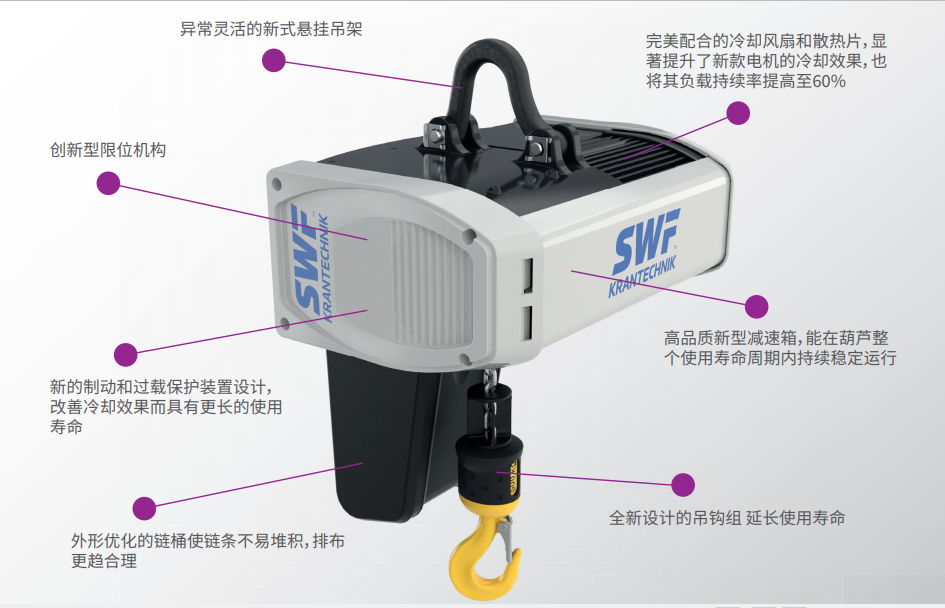 新款起升電機(jī)和全新設(shè)計的散熱片提供了更好的冷卻效果,繼而延長使用壽命。 此外,ATHLO系列頗具匠心的限位觸發(fā)機(jī)構(gòu)設(shè)計新穎葫蘆 ,使 限位無論是在常規(guī)使用抑或極端條件下均能完美工作。